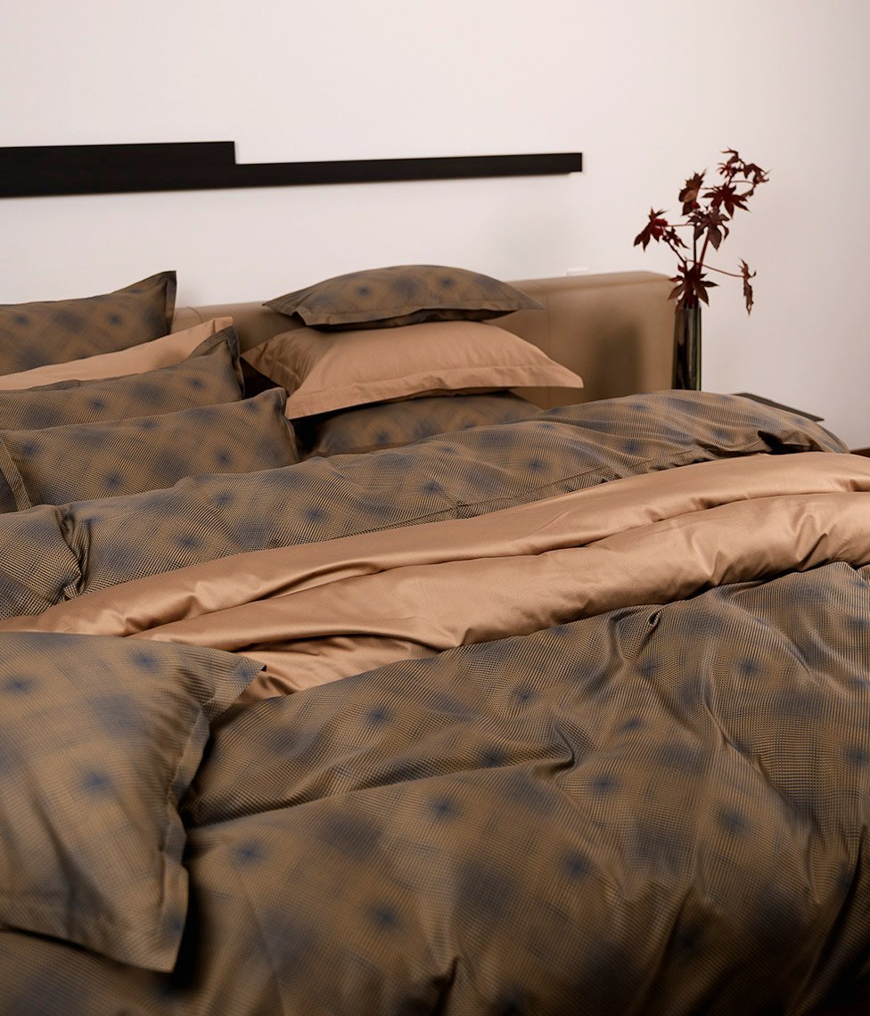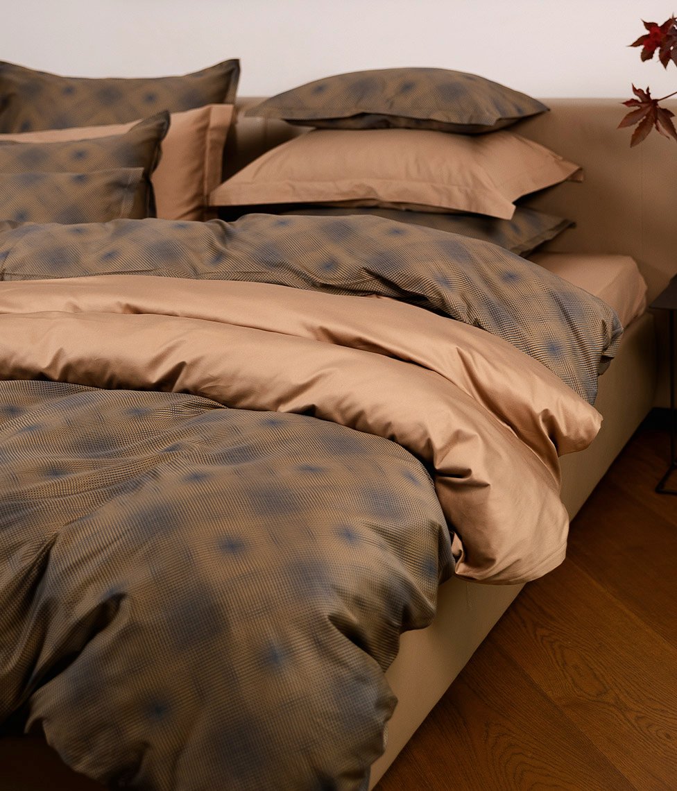 The Mirage Gold design opens up a play of illusion and reality. Like a mirage, dark blue lines flow and merge against a gold background, creating a subtle checkered pattern. Simple at first glance, but constantly changing upon closer inspection, this pattern captivates with its mystery and elegance. This geometric pattern design is perfectly revealed by the matching monochrome tones of Toffee, Anthracite and Dark Blue.