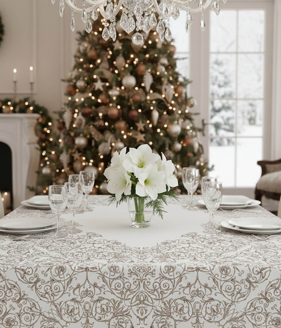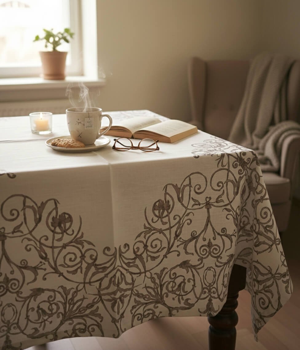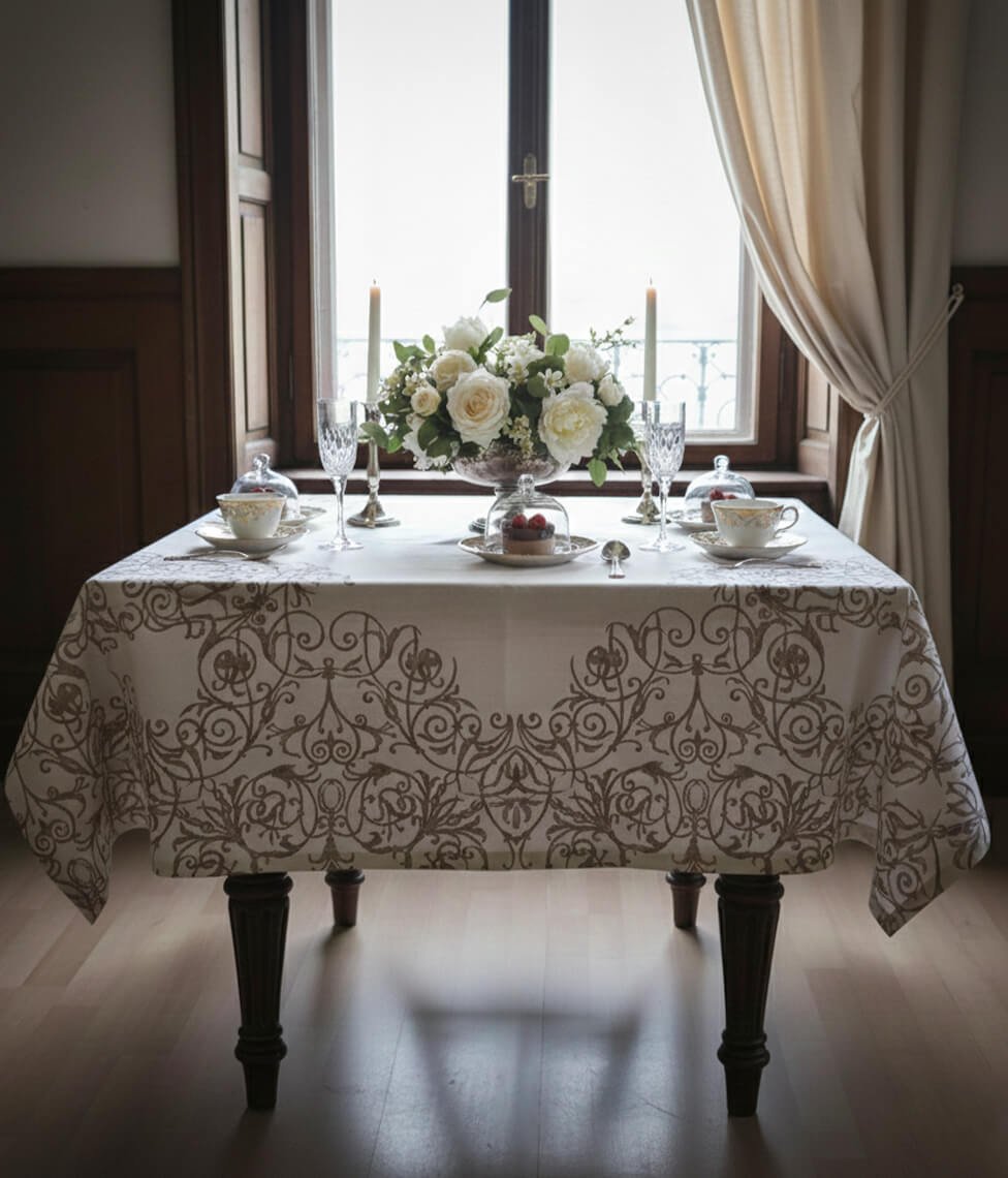 Sukurkite nepamirštamą atmosferą savo namuose su natūralaus lino staltiese, papuošta laikui nepavaldžiais klasikiniais ornamentais.