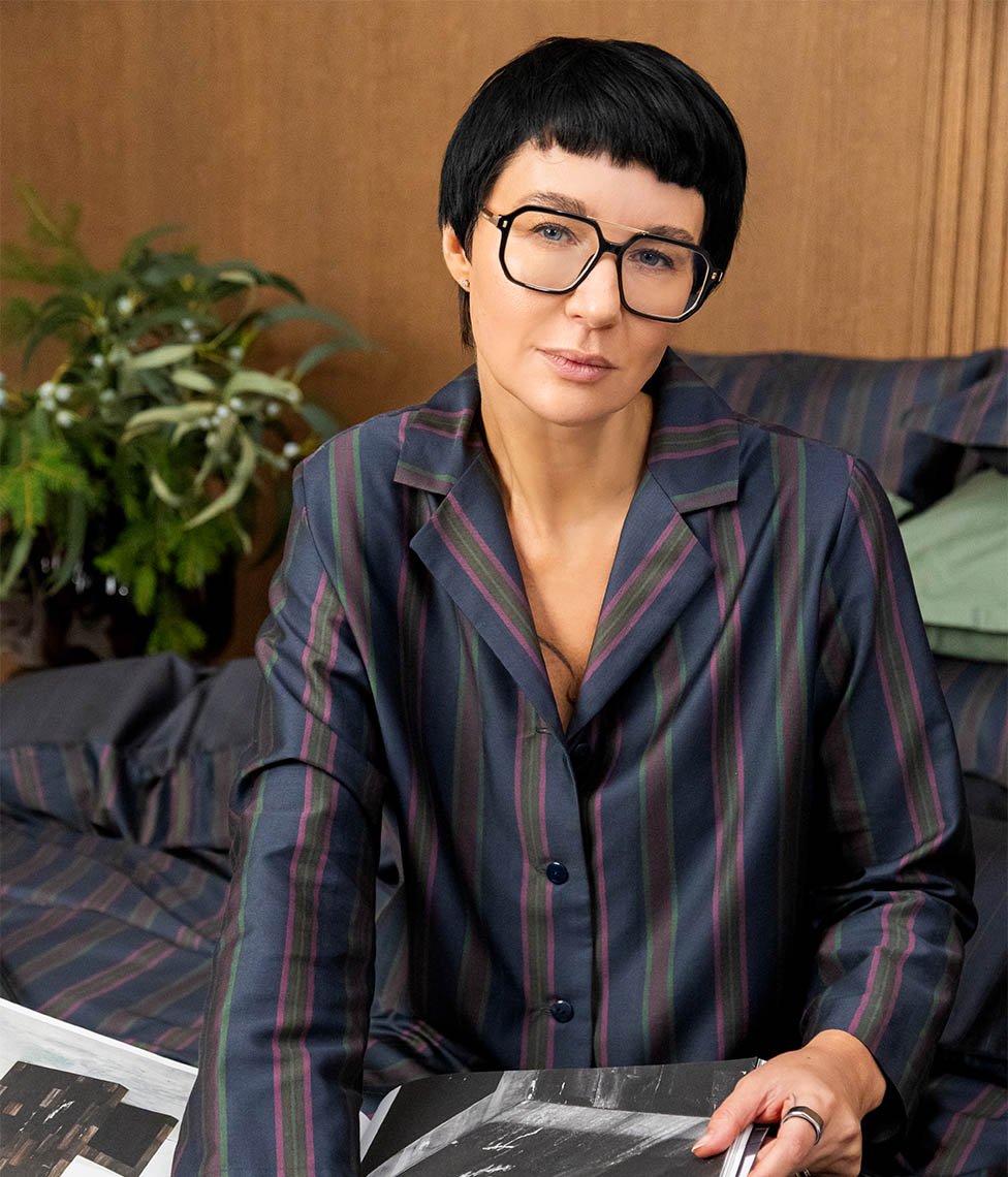 Šis ilgas pižamos komplektas pasiūtas iš itin švelnaus, prabangaus medvilnės satino, todėl yra patogus ir lengvas. Laisvo silueto švarkas ir kelnės nevaržo judesių, todėl pižama jaukiai priglunda prie kūno, užtikrindama ypatingą komfortą dėvėjimo ir miego metu. Švarkas užsegamas sagomis ir turi dvi kišenes, išlaikydamas minimalistinį, bet stilingą dizainą. Patvari ir elastinga kelnių liemens guma užtikrina, kad pižama išlaikys savo formą net po daugelio skalbimų, tad šiuo gaminiu galėsite mėgautis ilgą laiką.