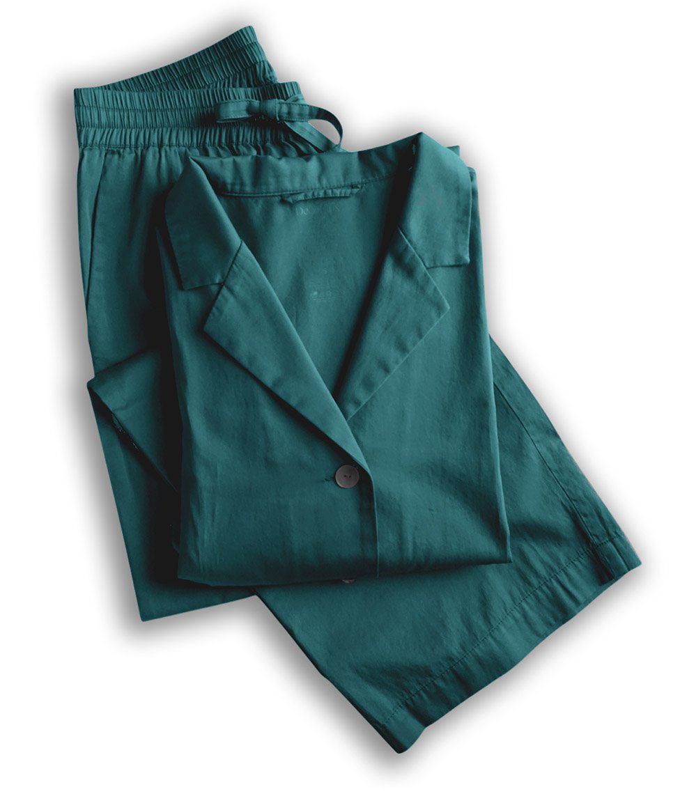 Šis ilgas pižamos komplektas pasiūtas iš itin švelnaus, prabangaus medvilnės satino, todėl yra patogus ir lengvas. Laisvo silueto švarkas ir kelnės nevaržo judesių, todėl pižama jaukiai priglunda prie kūno, užtikrindama ypatingą komfortą dėvėjimo ir miego metu. Švarkas užsegamas sagomis ir turi dvi kišenes, išlaikydamas minimalistinį, bet stilingą dizainą. Patvari ir elastinga kelnių liemens guma užtikrina, kad pižama išlaikys savo formą net po daugelio skalbimų, tad šiuo gaminiu galėsite mėgautis ilgą laiką.
