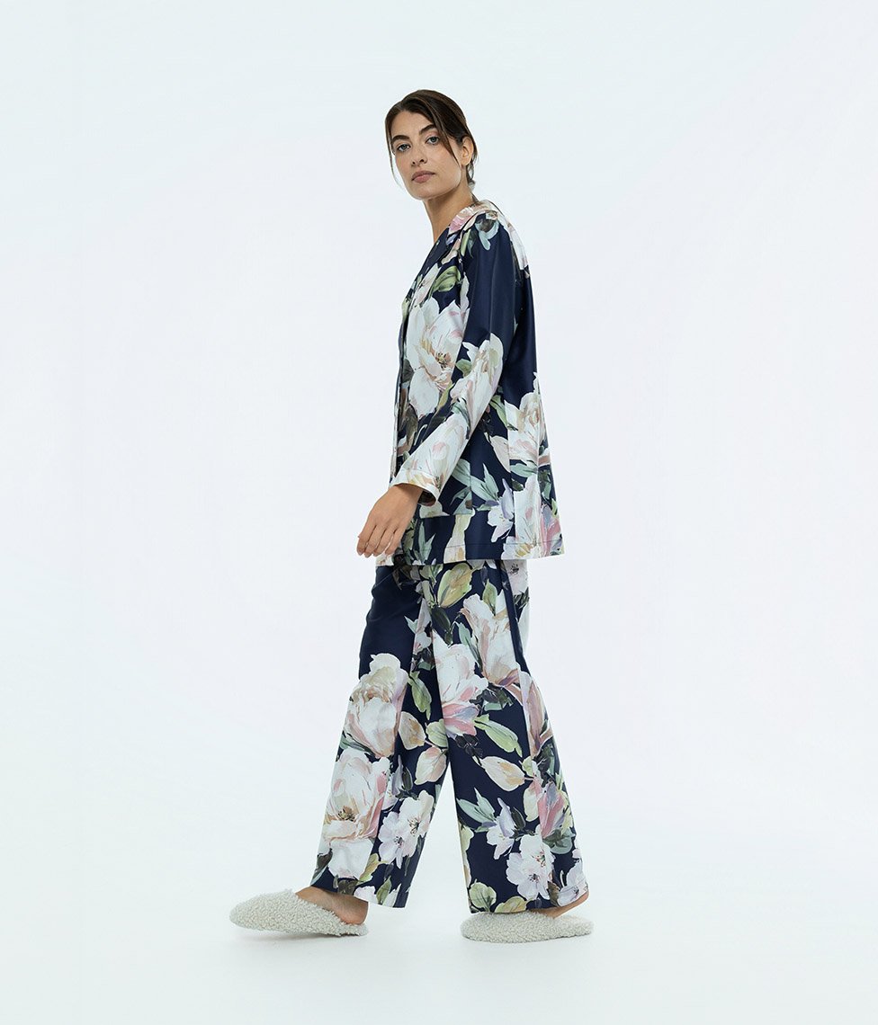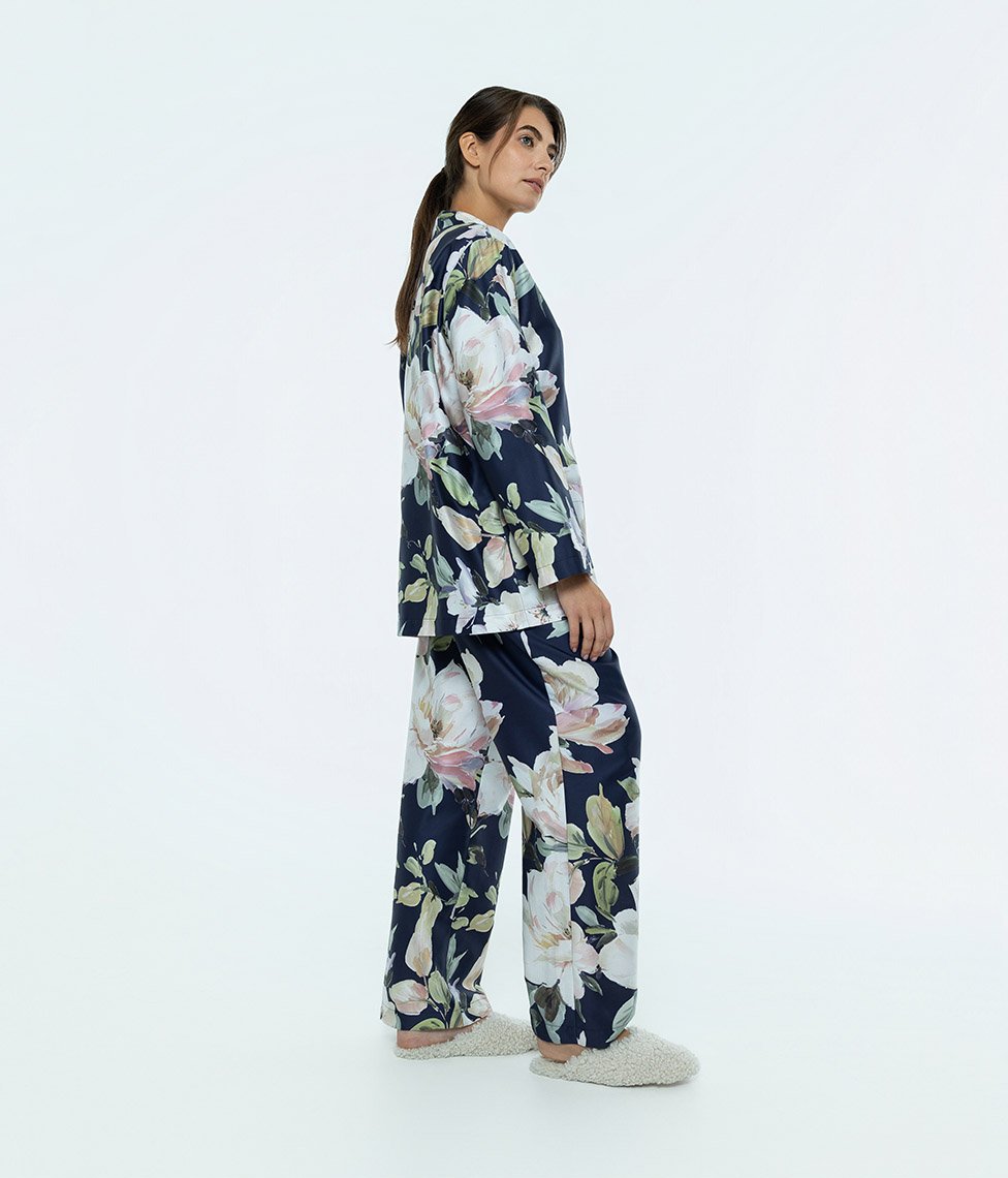 Šis ilgas pižamos komplektas pasiūtas iš itin švelnaus, prabangaus medvilnės satino, todėl yra patogus ir lengvas. Laisvo silueto švarkas ir kelnės nevaržo judesių, todėl pižama jaukiai priglunda prie kūno, užtikrindama ypatingą komfortą dėvėjimo ir miego metu. Švarkas užsegamas sagomis ir turi dvi kišenes, išlaikydamas minimalistinį, bet stilingą dizainą. Patvari ir elastinga kelnių liemens guma užtikrina, kad pižama išlaikys savo formą net po daugelio skalbimų, tad šiuo gaminiu galėsite mėgautis ilgą laiką.