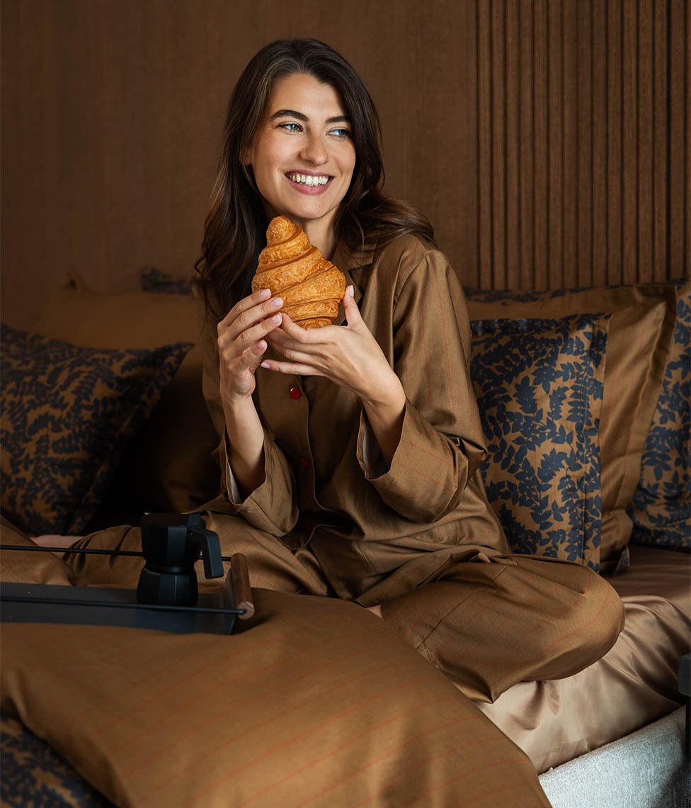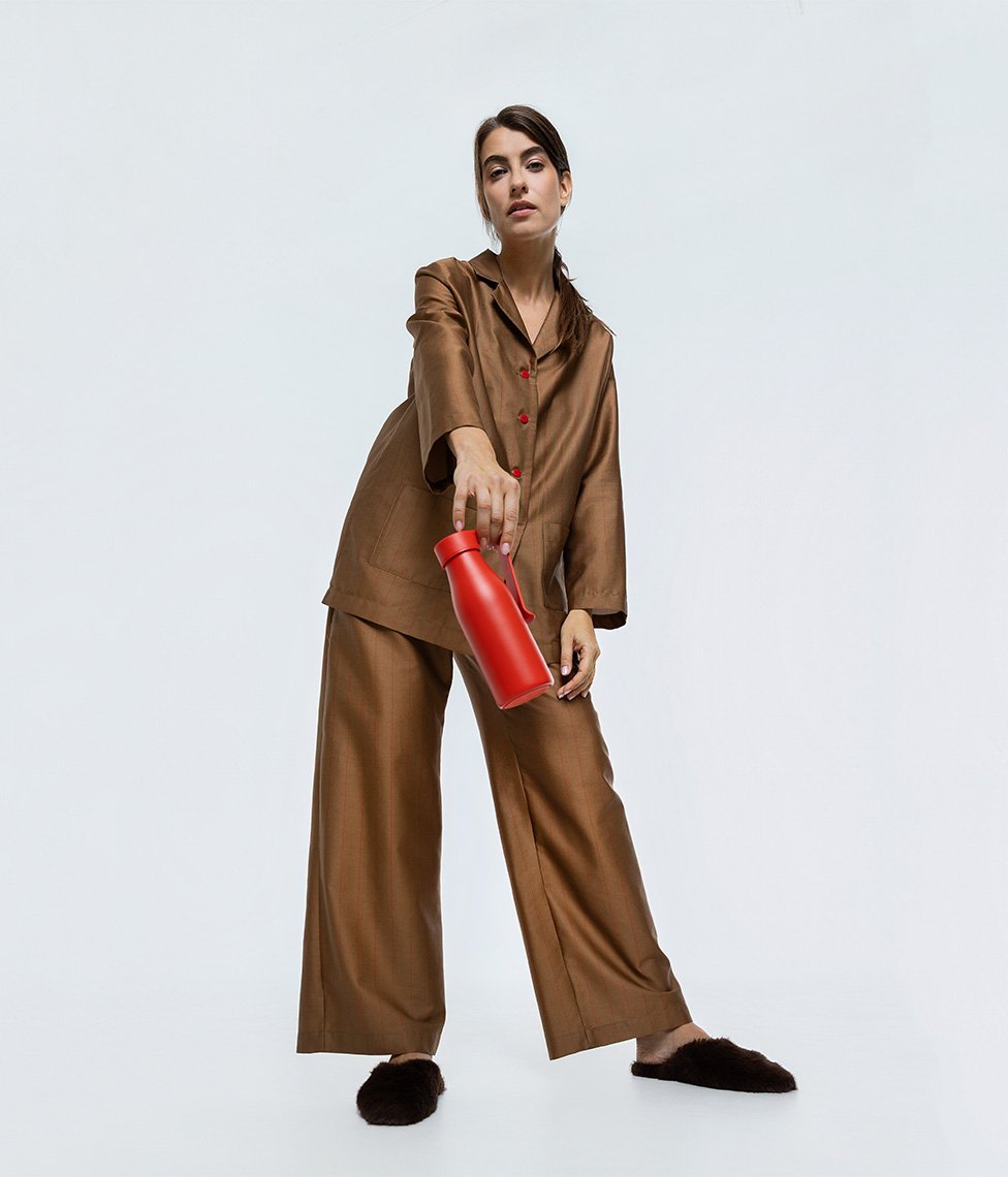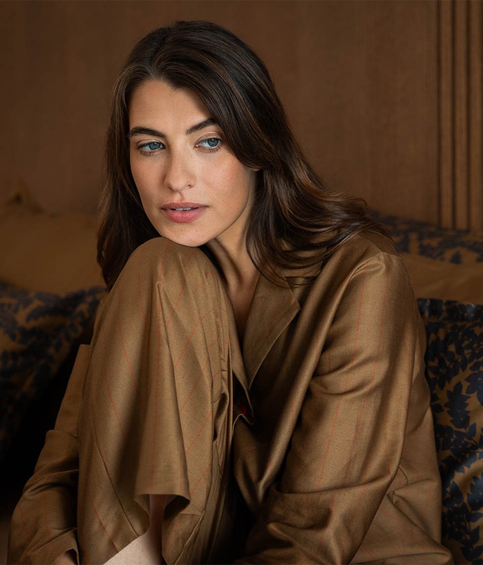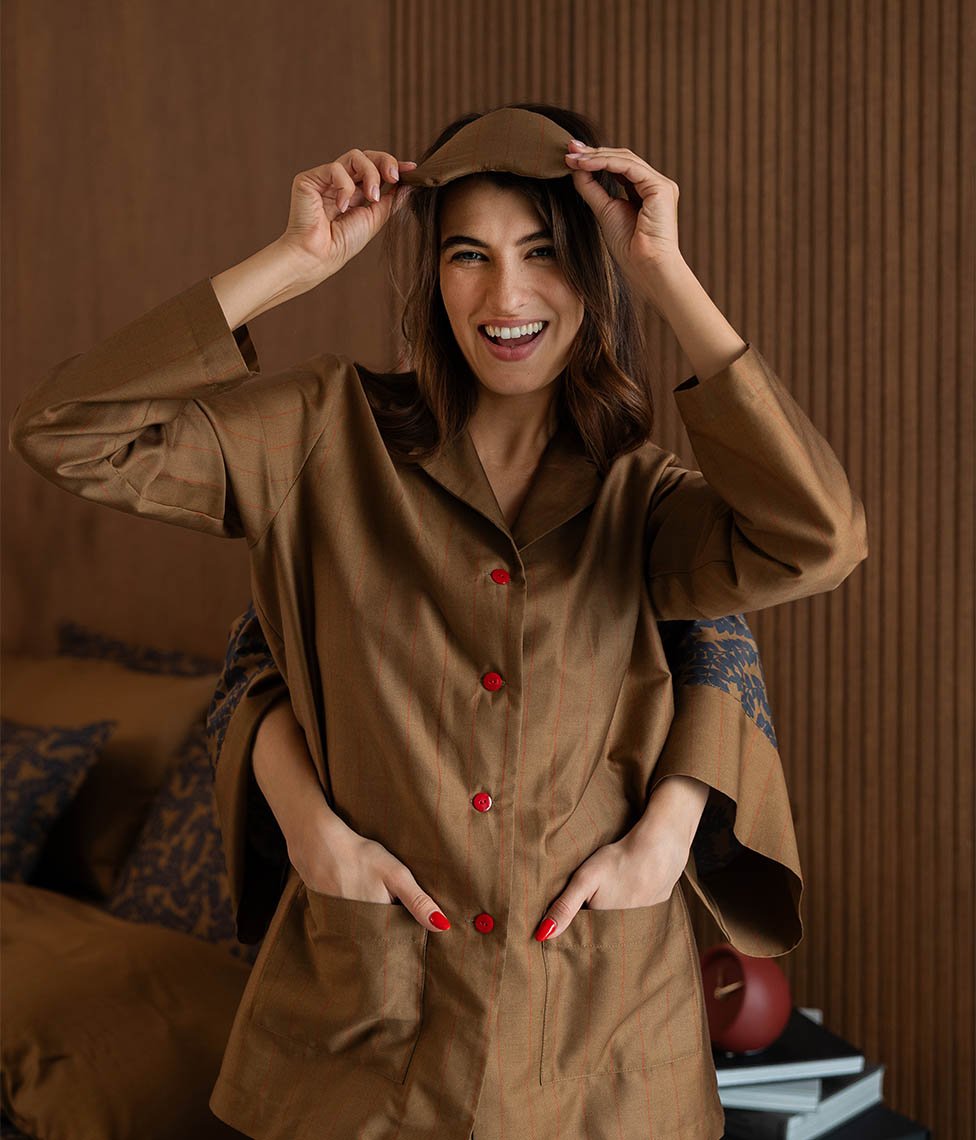 Šis ilgas pižamos komplektas pasiūtas iš itin švelnaus, prabangaus medvilnės satino, todėl yra patogus ir lengvas. Laisvo silueto švarkas ir kelnės nevaržo judesių, todėl pižama jaukiai priglunda prie kūno, užtikrindama ypatingą komfortą dėvėjimo ir miego metu. Švarkas užsegamas sagomis ir turi dvi kišenes, išlaikydamas minimalistinį, bet stilingą dizainą. Patvari ir elastinga kelnių liemens guma užtikrina, kad pižama išlaikys savo formą net po daugelio skalbimų, tad šiuo gaminiu galėsite mėgautis ilgą laiką.