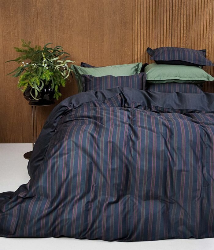 „Etno Baltic & Stripe in Line Dark Blue“ – dvipusis dizainas, kuriame susitinka tradicinių etninių motyvų detalės ir šiuolaikinis minimalizmas. Viena pusė žavi linijomis, susidedančiomis iš įvairiaspalvių gijų, ant tamsiai mėlyno fono, kuriančio gyvą, sodrų kontrastą. Kita pusė – modernus, minimalistinis raštas su šviesiomis linijomis, suteikiantis erdvei tvarkos ir ritmo. Šių dviejų skirtingų estetikų derinys leidžia lengvai pakeisti nuotaiką ir stilių vos apsisukus patalynę, o aukštos kokybės audiniai garantuoja komfortą ir ilgaamžiškumą. Komplektas puikiai dera su Salvia, Green Tree, Anthracite, Dark Blue bei Burgundy atspalviais.