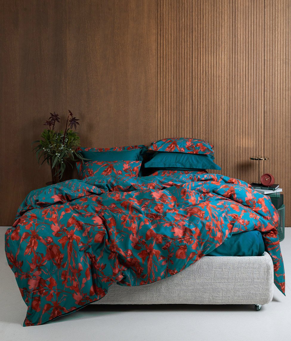 „Rainbow Blue & Diagonal Blue“ dizainas – tai drąsus spalvų ir raštų derinys, kuriame sodri mėlyna primena gilius vandenis, o raudoni gėlių motyvai suteikia energijos ir gyvybės. Viršutinė dalis alsuoja šviesesne mėlyno atspalvio gaiva, o apatinę puošia įstrižų linijų dinamika, kuri subtiliai kontrastuoja su žydinčiu raštu. Šis dizainas kuria išskirtinę atmosferą, kurioje susilieja ramybė ir temperamentas. Prie jo puikiai dera vienspalviai tonai – sodrus teal, ryškus red stone, šiltas terracotta ir gilus chocolate oud.