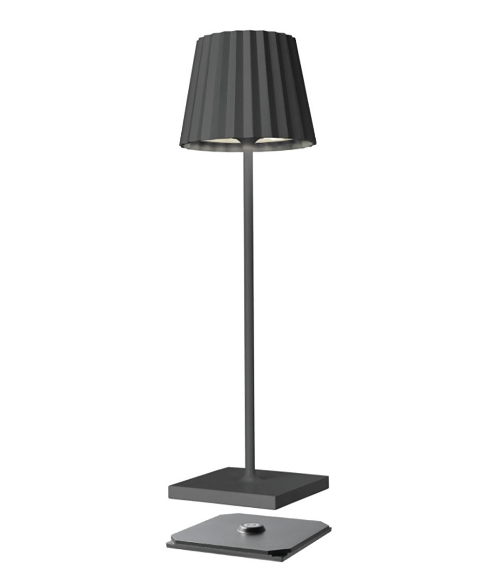 Lauko stalo lempa su išskirtiniu klostuotu gaubtu, kurią galima naudoti tiek patalpose, tiek lauke, nes ji turi IP54 apsaugos klasę. Pagaminta iš aliuminio ir padengta įvairiomis spalvomis bei raštais, ši lempa ne tik funkcionali, bet ir stilinga.