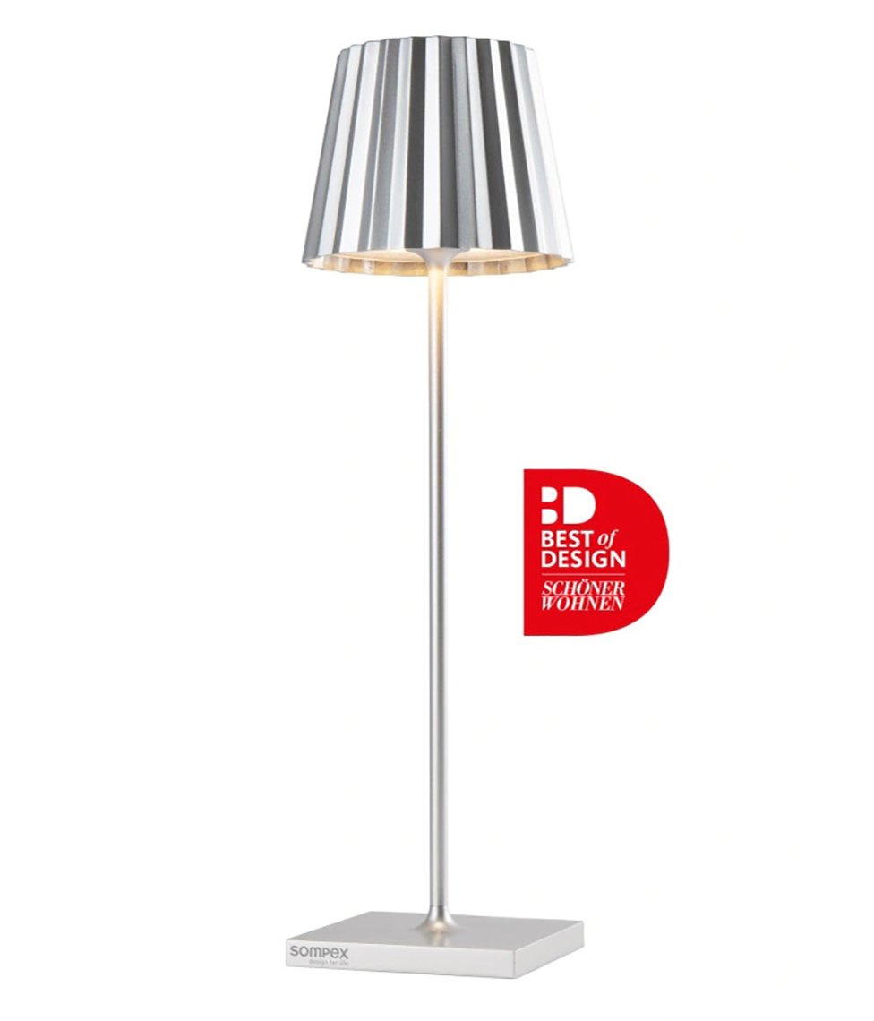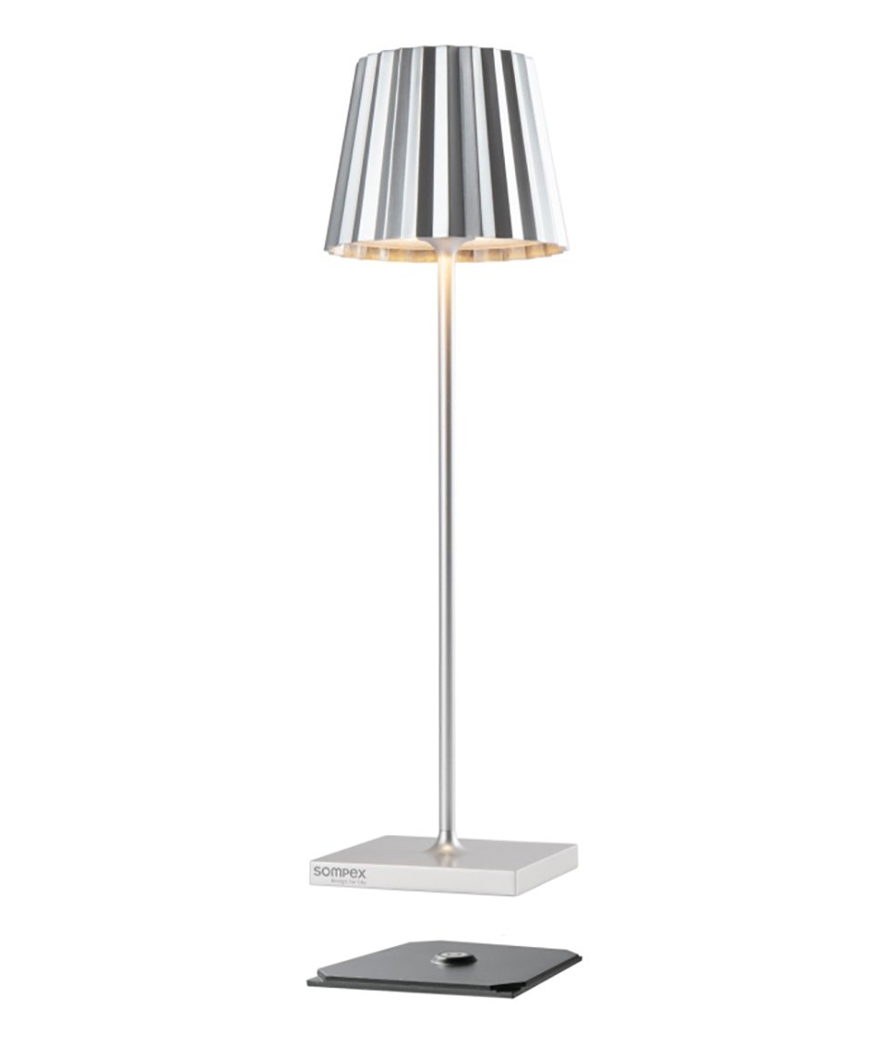 Lauko stalo lempa su išskirtiniu klostuotu gaubtu, kurią galima naudoti tiek patalpose, tiek lauke, nes ji turi IP54 apsaugos klasę. Pagaminta iš aliuminio ir padengta įvairiomis spalvomis bei raštais, ši lempa ne tik funkcionali, bet ir stilinga.